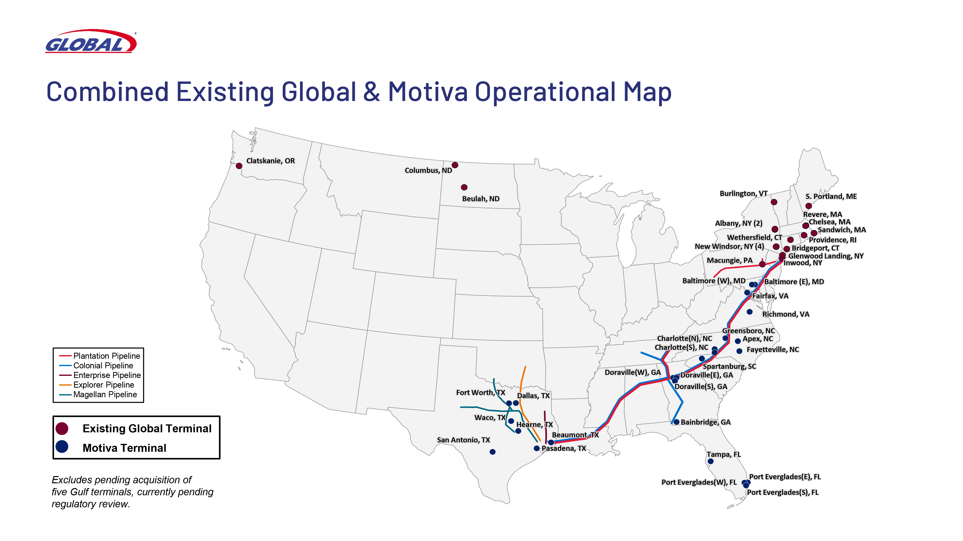 “This acquisition is an exceptional opportunity to deliver on our strategy and create value by expanding our footprint into areas with increasing population centers. As a premier operator of terminals, wholesale distribution and retail marketing, we believe these terminals allow us to leverage our expertise in supply and give us a platform for growth in all aspects of our business,” said Eric Slifka, Global’s President and Chief Executive Officer.